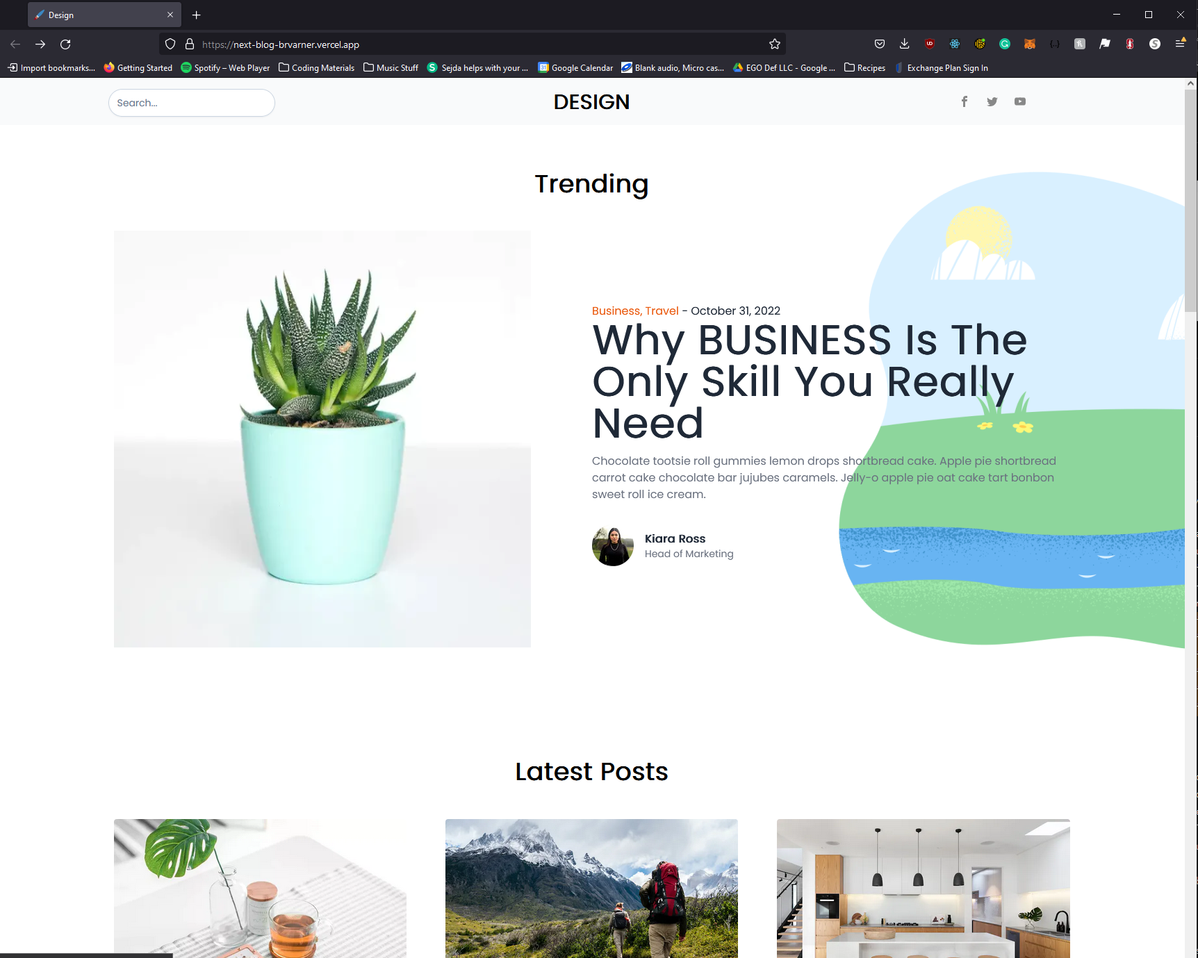 A blog built in Next.js with Tailwind CSS. Data served from a local api, and authors randomized for each article.